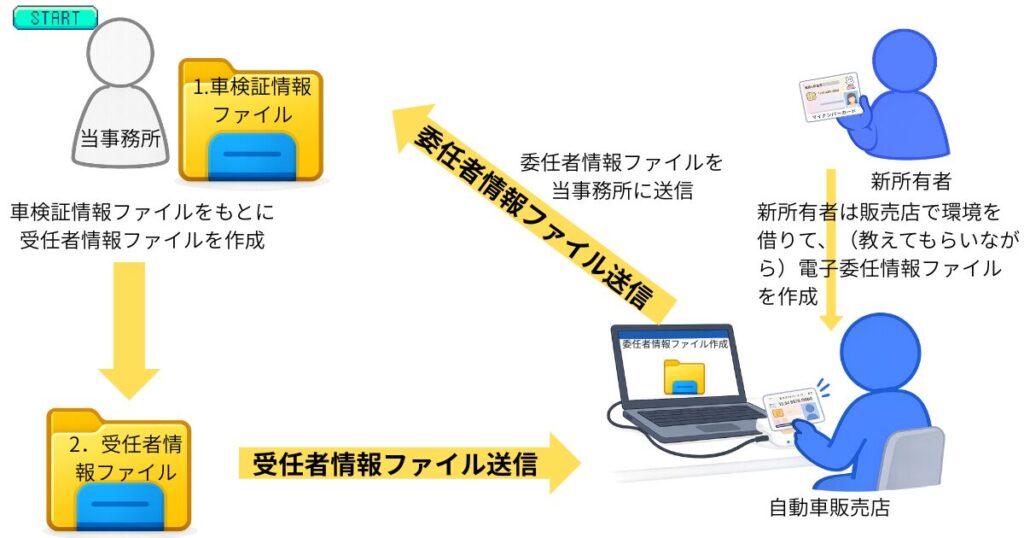 車が売れた際は、受任者情報ファイルを使って電子委任状(委任者情報ファイル)を作成し、そのデータをお送りいただくだけで手続きが進められます。